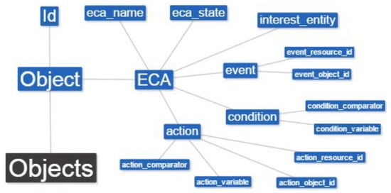 - ECA (event-condition-action): XML document with the information of the contract between two smart objects. The ECA contains the logic of the interaction service and informs the objects about the variables and the resources that intervene in the execution of an interaction service. The event and action are related to smart objects and the condition is defined by the user.