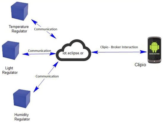 - Clipio: a mobile application that manages the objects of the test bed. It communicates its requests through the broker server, in this way it can create and eliminate interaction services, modify the states (turn on and off) of the basic services and interaction, and consult metadata about the objects. Clipio is developed under Android Lillipop (5.0 or higher); jdom (handling of XML), Paho (management of client MQTT) and kSOAP 2 (handling client SOAP) libraries were used. The application was installed on a LG Nexus 5 mobile device.