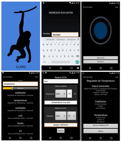 Figure 7 shows the different interfaces that Clipio displays to carry out the administration of the test bed services. The user goes through the home and start up interfaces of the application and then enters the interface where the creation of an interaction service begins. The user must enter the searches of the objects using words or phrases that identify him. In addition, he can adjust the search radius to detail the desired object. Clipio then requests the variables of the interaction service and finally the service is created. The remaining processes are similarly supported by Clipio in order to remove and modify services.