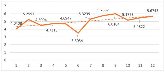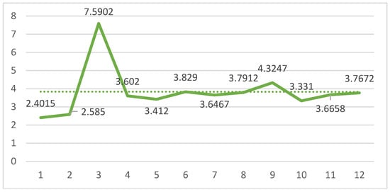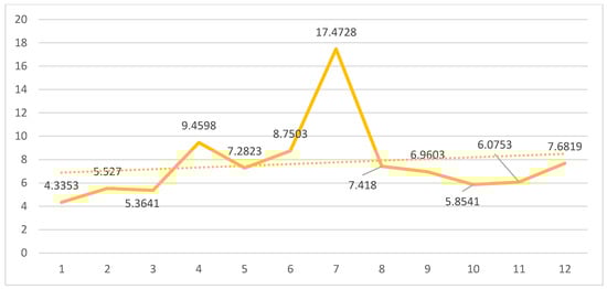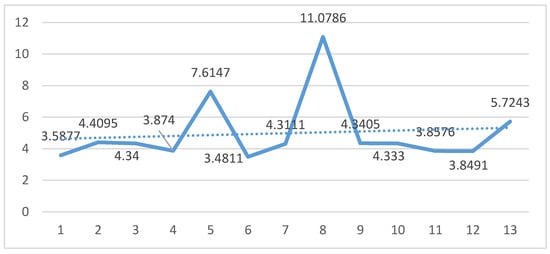 The reported times show an average latency of 4.92 ms, rating the result as an excellent quality, according to Table 2. The standard deviation is 2.2, this shows a low dispersion in the results. Figure 10 displays a low growth trend in time, but the use case has a significant peak in the 8 group. This peak can be caused by human mistakes, broken elements, or internet problems. Table 5 shows the data relation and statistics results.
