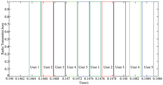 In order to verify the user time slot occupancy of CFDAMA-FP under the burst source, assume that the current number of users as five and the channel load as 0.1. The time slot occupancy distribution of users under the burst source is shown in Figure 3. In Figure 3, the x-label represents the current simulation time, and the y-label is the transmitter busy state, radio transmitter.busy. If the current user has time slot requests or data packets sent, the transmitter is busy with a value of one. At the initial stage of the simulation, the user calculated the number of time slots needed to send the data and added the calculated results to the access control packet to send out through the access slot. As illustrated in Figure 3, five users occupy five different time slot points, respectively. The interval of each time slot point is about 0.0002 s, which meets the slot slot length in the simulation parameters table.