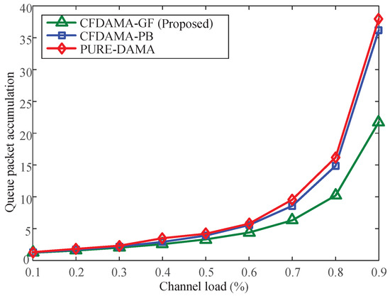 Figure 4 shows the relationship between the number of packets in the user queue and the channel load. The channel load is the average throughput of the system, indicating the burst level of the packets sent by the ON/OFF source model, and the unit is bits per timeslot. The queue packet count refers to the number of queued packets in the user’s send queue. The higher the channel load is, the more obvious the trend of group queues in the user’s queue will be because the total amount of data packets for all current users has exceeded the range of the capacity of the entire satellite system. Thus, it should be queued for transmission at the next moment. When the channel load is small, the queue stacking number of the three protocols almost has no difference because the data packets in the user queue do not need to be queued when the system channel load is small. When the channel load increases, the number of queues in the CFDAMA-GF protocol is significantly lower than those of the CFDAMA and PURE-DAMA methods because the CFDAMA-GF protocol adds a gray forecast method to probe the source when a user gains access, thereby creating a user’s current appointment. The number of timeslots is greater than the number of queued packets in the current queue, ensuring that packets arriving at the next moment can be sent in time without queuing.