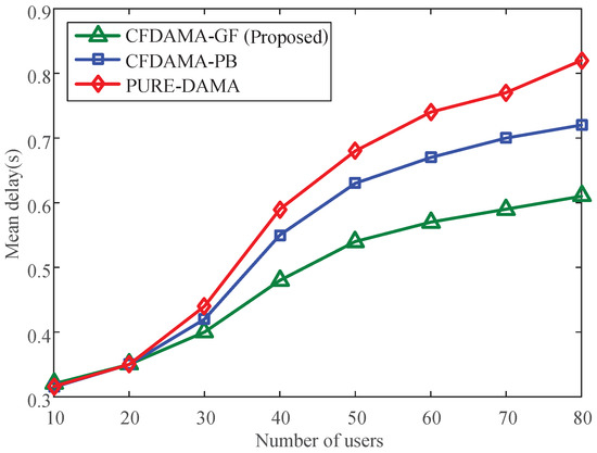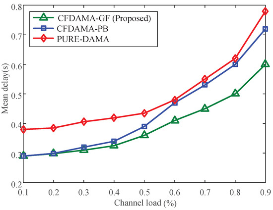 When the channel load increases, the burst strength of data packets generated by the source increases, and the number of users with service transmission increases, resulting in an insufficient number of remaining timeslots in the satellite after the demand assignment is allocated. The average delay between the CFDAMA-PB and pure DAMA protocol slightly varies. Moreover, the CFDAMA-PB protocol may cause the users with a large demand to fail in obtaining timeslot allocation in time. The CFDAMA-GF protocol sorts users according to the timeslots’ reservation size from high to low when satellites are allocated by demand assignment. In the next step, the corresponding priority number is set. A high number of users with high reservations corresponds to a high priority. This relationship ensures that the user of the slot reservation request can be allocated in time when the channel load increases. A user with a substantial demand preferentially performs processing. Thus, the average communication delay performance of CFDAMA-GF is better than that of the two other methods.