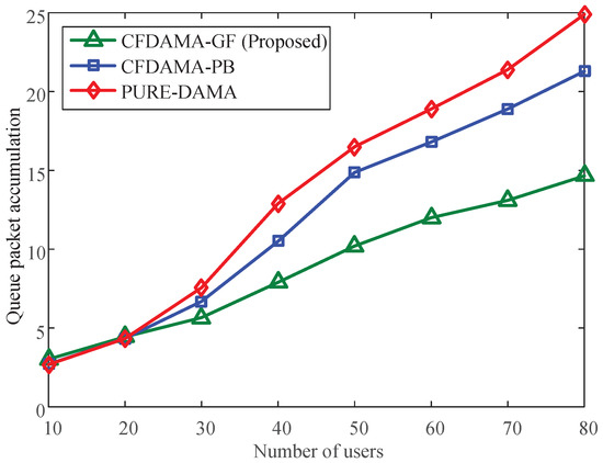 Figure 7 shows the relationship between the average number of stacking packets in the queue and the number of users. When the number of users with access increases, the number of queues increases. The number of service packets and the average number of queues increase as the number of users increases. Figure 7 further illustrates that the performance of the three protocols is similar when the number of users and the number of service packets are small. As such, the three protocols do not remarkably vary. When the number of users in the system increases, the CFDAMA-GF protocol ensures that multiple users access the gray forecast algorithm, and the number of stacking packets in a user queue decreases.