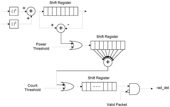 Measuring the signal power requires averaging over a window. If this window is short, the averaging is not enough, so that its averaged power will not give a secure measurement. Sudden noise can crash the detection algorithm. Accordingly, it is important to have a long enough window size for averaging. The maximum window size is limited by the shortest pulse width, even as short as 0.5 µs, which is defined in Reference []. With this short pulse width, only 10 samples are available with 20-MHz sampling. The designed detector uses eight samples for averaging the power, that is, a window size of 0.4 µs. Thus, for every 0.4 µs, the averaged power output is passed to a comparator that compares it with a threshold and determines if there is a signal.