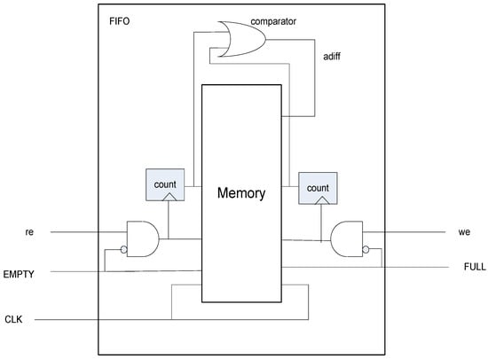 The memory depth should also be decided in terms of the write and read speeds. The write speed should be slower than the read speed, otherwise the memory will be full and subsequent data would be lost. The size of memory is set as it stores 64-bit time stamp data. This memory depth can store over approximately 1 ms if signals appear 10 times in 100 µs. Then the upper layer implemented in a CPU (Central Processing Unit) processer can have enough time to read the memory at its speed. The memory size is 64 × 32 bits = 2 Kb. This memory size can be adjusted to a smaller size if the used CPU has faster read speed. The memory is set as a circular first-in-first-out (FIFO) or FIFO with dual ports. Since the write and read timings are not synchronized, FIFO is the best choice to transfer data. The time stamps are written any time a signal is detected. The upper layer reads the FIFO any time, independently of the write timing. Figure 3 shows the diagram of the implemented FIFO.