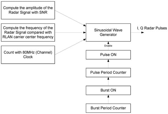 Figure 4 shows the block diagram of the radar transmitter. With the input signal parameters set by a user, the signal power, frequency, and phase are computed and then fed into the sinusoidal generator. On the other hand, the timings of the pulse train are computed with counters, burst counter, and pulse counter. The pulse ON signal enables the sinusoidal wave generator to output the radar signal pulses.
