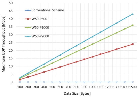 Figure 5 demonstrates the improved detection performance of the proposed detection scheme, and Figure 6 shows the improved maximum user datagram protocol (UDP) throughput. The simulation model was built on the bit- and cycle-accurate C simulator which is the same model used for the implemented commercial chipset and was certified through standard Wi-Fi certification process. In Figure 5 and Figure 6, “PRO” and “CON” refer to the proposed scheme and conventional scheme, respectively. Ten thousand radar samples were used for this test. “W” and “P” refer to pulse width and periodicity of radar signals, respectively. As a result, shorter pulse width and periodicity result in performance degradation due to the limited resolution of the detector. However, the proposed scheme outperformed for test scenarios. In Figure 6, W50-P2000 was much better than W50-P500 because short periodicity increased the interfered duration. However, all the cases of the proposed scheme outperformed when compared with the conventional scheme.