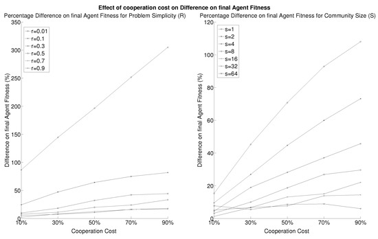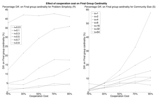 According to the effect of the Cost of Cooperation on Problem Simplicity (Figure 1 Left), the simpler the tasks (from to ), the lesser the difference on the final agent fitness. Moreover, the difference increases from 15 to in conjunction to the cooperation costs. On the contrary, for a difficult task (), the relationship between the cost of cooperation and the difference in the fitness is almost linear. The main reason for such behavior is that the cost of cooperation influences the reduction of the fitness measure in two ways: (i) directly, where the agent has to pay a cost to cooperate, and (ii) indirectly, where fewer agents want to cooperate because of the direct cost, and, thus, the cooperation is infrequent and the agents have fewer advantages. However, from the point of view of the community size (Figure 2 Right), the cost of cooperation affects the smaller group more than the larger ones. As for the smallest community size (i.e., ), as well as for the smallest problem simplicity (i.e., ), the final difference on the fitness is greater than . Such an effect is due to the fact that, especially for very difficult tasks (i.e., ), the cost of cooperation is frequently paid without any subsequent payoff, therefore producing a negative final fitness for the agent.