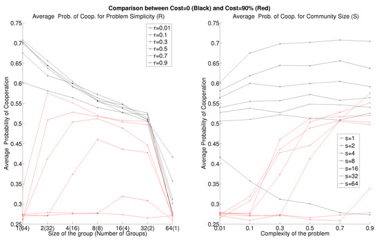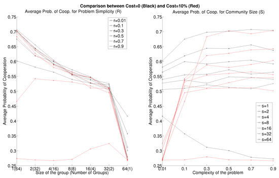 Comparison of the final average probability of cooperation for the condition with the cost of cooperation equal to 0 (dark lines) and the cost of cooperation equal to 10% (red lines), compared to the problem simplicity (left plot), and to the group sizes (right plot).