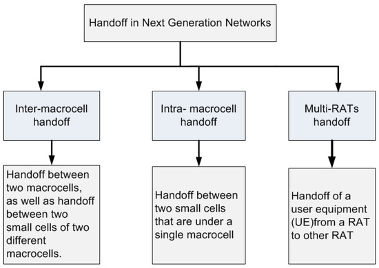Close to zero latency and maximum throughput are key features of the next generation networks. The achievement of these features require efficient and reliable inter cells or intra cell hand-off (or handover). Hand-off refers to the process of sharing the dynamics of mobile networks such as frequency, time slots, spreading code or combination of them without degradation of the quality of service. Hence, hand-off management is critical for next-generation networks. Because of the core requirement of next-generation networks such as ultra-densification, high mobility, accessing the multiple radio access technologies make the handoff management more complex. The next generation networks will be ultra dense comprising of the combination of microcells and macrocells and, thus, these will involve different types of hand-offs such as inter-macrocell handoffs, intra-macrocell handoffs and multi-RATs handoff, as shown in Figure 3.