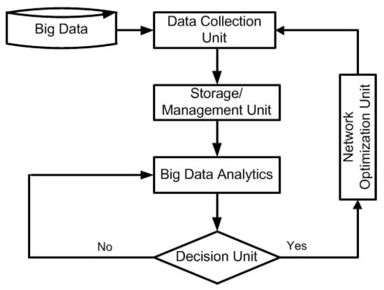 Figure 5 represents flow structure of big data for next generation networks optimization. It is a closed-loop process and shows that, firstly, big data are collected from user’s equipment as well as from a network. After collection of such huge data, storage and management of big data are also critical tasks. The data that are collected by the collection unit are in the raw form. These raw data include irregularities, misleading patterns, and noise. In this form, data cannot be sent to big data analytics unit for processing. Thus, big data storage/management unit performs data pre-processing and filtering to make the data ready for data analytics unit. On pre-processed and filtered data, intelligent decision-making task is performed by the big data analytics unit. In this unit, advanced data analytics and machine learning algorithms are used for transformation of data into useful data. Finally, useful or actionable data are fetched to network optimization unit. As it is a closed loop process, the data evolved from the network further fetch to big data storage unit and so on. In this way, this closed loop phenomena works and network optimizes.