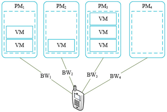 We consider the real cloud environment where all tasks run on the virtual machines and a physical machine could deploy several virtual machines. The proximity cloud may reduce data transmission time between the mobile device and cloud. In our paper, we consider the bandwidth between mobile devices and the PMs. As shown in Figure 1, represents the physical machine (PM) in cloud center that is used to run VMs. We can see that the number of VMs running in each PM are different. The is not in a running state that there are no VMs running in. The bandwidth between mobile devices and the PM is denoted as correspondingly. Suppose that the number of current running PMs is and the max number of VMs that PMs could run is . The number of current running VMs on these PMs is and the max number of VMs each PM can run is . We defined utilization rate of PM as follow