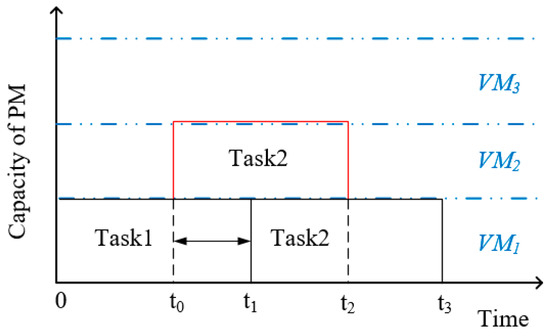 where is the execution time of offloaded tasks in cloud server, and is the amount of data to be transferred between the mobile device and the cloud server. is the waiting time when an offloaded task is assigned to the VM that existing another task is running in. As shown in Figure 2, the Task1 is running on in the time among 0 and , and only one VM is running in current PM during that period time. The of Task1 is . If an offloaded task Task2 arrives at , then there are two ways to choose for running the offloaded task Task2. One way is that the Task2 is assigned to , it will be executed at when the Task1 is completed. Therefore the waiting time caused by this way is . Another way is that the Task2 is offloaded to a new running VM that no task is running on. The Task2 can be executed in at and there is no need to wait, . Moreover, the VMs from different PMs are in different running states, which could lead to different waiting time for offloaded tasks. Meanwhile, the bandwidths between mobile devices and the PMs are also different. We need choosing the optimal PM for offloaded tasks to make the delay lower according to Formula (3).