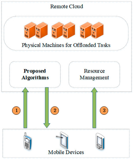 Our proposed algorithms will be deployed in the remote cloud, and the process of offloading tasks to the remote cloud is illustrated in Figure 3. Fist, the information of offloaded tasks will be sent to Proposed Algorithms in step 1. According to the information, the module of Proposed Algorithms can select an optimal physical machine for executing the offloaded tasks. Therefore, the ID of the obtained optimal physical machine from the module of Proposed Algorithms will be sent back to the corresponding mobile devices in step 2. Moreover, the offloaded task and the ID of the optimal physical machine will be sent to the module of Resource Management. Finally, the module of Resource Management arrange the offloaded tasks to corresponding physical machines.