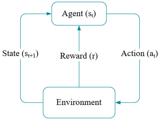 Reinforcement learning (RL) is a subfield in machine learning, in which the agent can learn from trial and error by interacting with the environment and observing reward [19]. As shown in Figure 4, the agent, also referred to as the decision-maker, obtains an immediate reward from the environment according to the current action when its current state is . Moreover, the agent’s state transits to after executing the action . The goal of RL is to lean an optimal policy for an agent that can make it choose the best action according to current state.