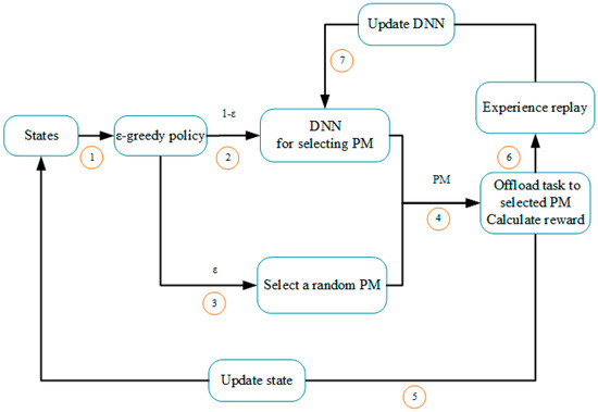 The Figure 5 shows the process of our proposed task offloading algorithm based on DRL that focuses on the online Q learning. When the offloaded task arrives at time step , the algorithm obtains current states and decides how to select the action that represents the PM in cloud that the offloaded task executes on. It will select a random action with probability as shown in step 3 and select a PM that has a large value through the estimation of DNN with probability as shown in step 2. In step 4, the system offloads the task to selected PM and calculates the reward value according to Formula (10). Moreover, the system updates the current state with in step 5 and updates the current value according to Formula (6). Store the transition profiles in experience memory for experience replay in step 6. Finally, update the parameter of DNN according to experience memory . The details of our proposed algorithm are shown in Algorithm 1.