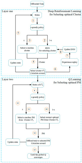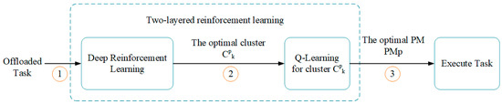 Our proposed two-layered reinforcement learning structure comprises of DRL and RL. Different from DRL for task offloading, TLRL gives a current optimal cluster of PMs according to the current state first by using DRL first. Then the optimal PM is obtained by using Q-Learning for the cluster . The detailed flow of task offloading algorithm based on TLRL is shown in Figure 7.