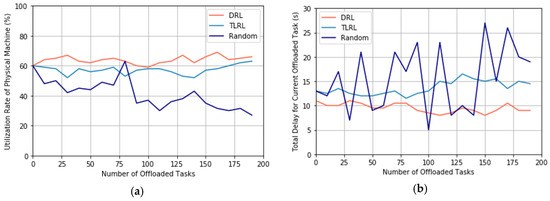 These results are shown in Figure 8. It is shown that the random algorithm results in severe fluctuation, in terms of the utilization rate of PMs and delay, compared to the cases of DRL and TLRL. First, in Figure 8a, both the DRL and TLRL, the utilization rate of PMs is maintained at the level around 60%, whereas the random algorithm leads to an inferior level around 23% for the utilization rate of PMs, which may lead to the waste of cloud resources. Second, in Figure 8b, it can be seen that based on DRL and TLRL, a lower delay for each offloaded task can be obtained. It changes between 9 s and 15 s. However, frequent changes in the delay for the offloaded task by using the random algorithm, where the max delay is around 27 s. This is because the random approach selects a PM to execute the offloaded task randomly. According to the definition of delay in Formula (3), if is larger and is smaller, it will lead to a higher delay correspondingly. On the contrary, if is smaller and is larger, a lower delay is obtained. Therefore, this random selection approach for PMs can lead to a random delay in each decision step, which may cause the high jitter in the delay for offloaded tasks. We can conclude that our proposed algorithms based on DRL can get a better performance for increasing the utilization rate of PMs and decreasing the delay caused by task offloading than random policy.