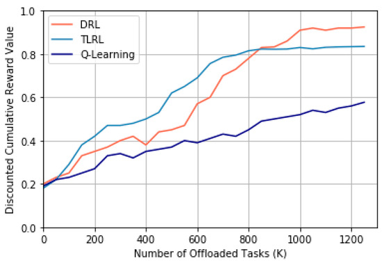 To discuss above problem, we start from a randomly initialized state for DRL, TLRL, and Q-learning. We compare convergence speed of the three algorithms for task offloading. The results are given in Figure 9.