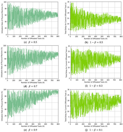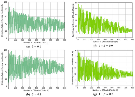 From these results, we can conclude that our proposed TLRL algorithm can trade off the utilization rate of PMs and delay by adjusting the weight in the reward effectively. According to Formula (10), the weights for the utilization rate of PMs and delay are and respectively. The experimental results in Figure 10 show the process of online learning optimal policy when β takes different values and track the changes of the utilization rate of PMs and delay during the learning process. We assume that the number of needed offloaded tasks is more than 800 in a real MCC environment and our proposed algorithm could converge. Therefore, our proposed algorithm will lean an optimal policy, which make the utilization rate of PM and delay keep stable in an interval. In Figure 10a–e, we can see that the utilization rate of PMs converges to a larger value when the weight factor is set to a larger value. Correspondingly, the weight of delay for current offloaded task becomes smaller, which lead to a larger delay. Therefore, if the utilization rate of PM is preferred, then a larger β is chosen and vice versa. Moreover, the TLRL algorithm can learn the optimal policy for task offloading with the increase of offloading tasks. This is because the TLRL comprises with DRL in layer one and Q learning in layer two, both of the two methods can converge according to Bellman Equation. We define the global Q-function for TLRL algorithm given by Formula (18), which indicates the convergence of TLRL algorithm. We can see that is composed of the Q values from above two algorithms. Therefore, TLRL algorithm can also converge which indicates that it can learn the optimal policy. Therefore, the two indicators will become stable in a certain interval that is related to the value of .