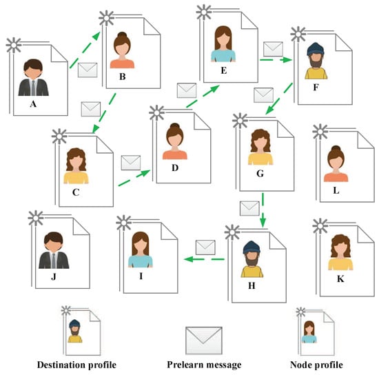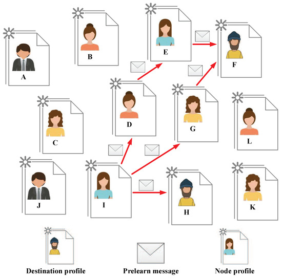 As shown in Figure 4, during the Forward phase, the n o d e I , which is the last node to be routed in the Predict phase, starts to make delivery decisions for Prelean messages. The n o d e F and n o d e H belong to the destination profile that satisfies the message delivery function p f defined by the minimum weight. Moreover, according to the probability prediction matrix W n × n , the n o d e D , n o d e E and n o d e G are the users that possess a bigger probability of future meeting with the destination profile than the n o d e I . Therefore, the n o d e I directly or indirectly sends Prelearn messages to the suitable relay nodes n o d e D , n o d e E and n o d e G , and the Prelearn messages will be forwarded to the destination profile n o d e F and n o d e H eventually.