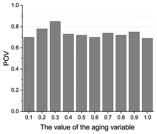 In this simulation, we first evaluate the impact of the aging variable on the probability of the destination profile receiving Prelearn messages ( P O V ) . As shown in Figure 5, when the value of the aging variable changes, the corresponding value of P O V always exceeds 0.7. Moreover, the P O V reaches a maximum value of 0.85 when the aging variable is 0.3. Figure 6 shows the impact of the phase transition value on the probability of the destination profile receiving Prelearn messages ( P O V ) . As it can be seen, when the phase transition value increases from N / 4 to N, the fluctuation range of the P O V is from 0.3 to 0.8. Particularly, when the phase transition is at N / 3 . 5 , the Prelearn message has not only obtained enough statistics about the state of the network but also found the destination profile by the message delivery function. Therefore, the message carrier can make the suitable delivery decisions for Prelearn messages, the efficient data transmission performs, and the P O V gets the maximum value of 0.8.