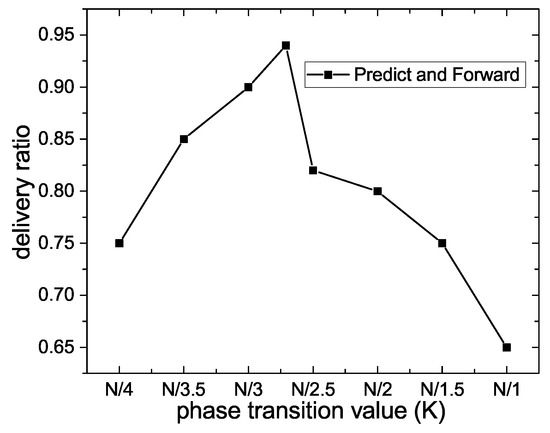 Figure 7 exhibits the impact of the phase transition value on delivery ratio. As it can be seen, the broken line first rises sharply and then falls rapidly. This means the phase transition value plays a significant role in the delivery ratio. A short Predict phase may miss the optimal candidate in the data transmission process, while a long Predict phase may imply that a large number of irrelevant nodes participate in the forwarding process of Prelearn messages. When the phase transition occurs at the optimal moment n / 3 . 5 , message carriers select the suitable relay nodes based on reliable information about the state of the network, and the destination profile is more likely to have appeared in the Predict phase, so the delivery ratio reaches the maximum value of 0.95.