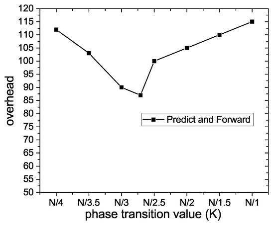 Figure 8 shows the influence of the phase transition value on network overhead. As it can be seen, the broken line first drops rapidly and then rises slowly. The later the phase transition occurs, the more the nodes take part in the forwarding process of Prelearn messages. Meanwhile, the number of nodes unrelated to the process of data transmission also increases, and more time and resources are wasted in transmitting Prelearn messages to the unrelated nodes, so the network overhead presents a rising trend. However, When the phase transition occurs at the optimal moment n / e , the Prelearn message acquires sufficient information about the state of the network, the node obtains the exact probability of future meeting with other nodes, and the routing and delivering of the Prelearn message are at their optimal state, so the network overhead gets the minimum value of 85.