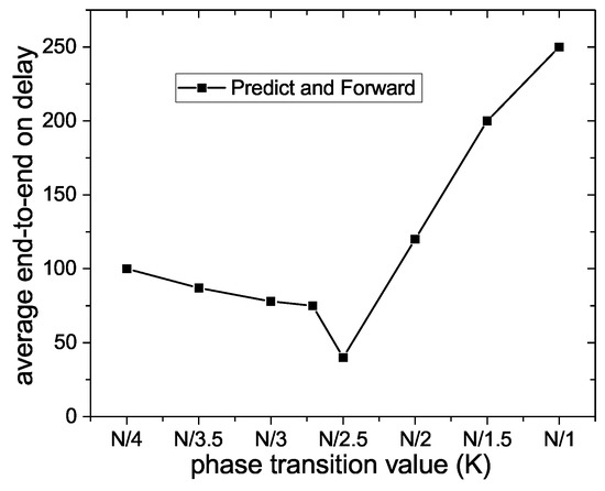 Figure 9 exhibits the influence of the phase transition value on average end-to-end delay. As it can be seen, the broken line first declines slowly and then rises rapidly. In other words, when the number of the nodes routed by Prelearn messages increases, the number of the nodes participating in the data transmission process also goes up, so the average end-to-end delay in Predict and Forward algorithm decreases constantly. However, when the transition phase exceeds the optimal moment, more unrelated nodes participate in the routing and forwarding of Prelearn messages, the number of hops in a successful data transmission increases and a large amount of energy is consumed in mission calculations and information transportation. Consequently, the average end-to-end delay in the Predict and Forward algorithm begins to rise.