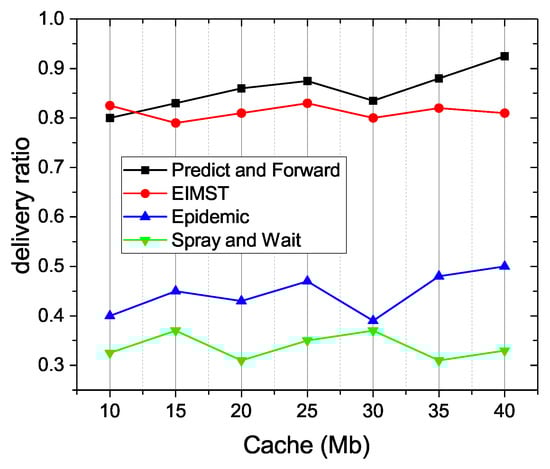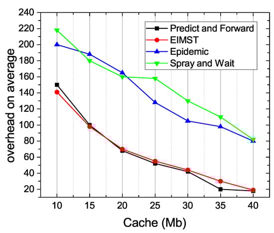 Figure 11 shows the comparison results between the four algorithms in terms of overhead on average. As it can be seen, with the increase of the cache space, the overhead on average drops dramatically. Moreover, the overhead on average in Predict and Forward scheme is the lowest among the four algorithms. When the cache space is over 20 Mb, the overhead on average in Predict and Forward algorithm always keeps the lowest, because it adopts two different phases to implement the optimal process for data transmission. When an optimal phase transition is found between Predict and Forward phases, the number of hops of a successful data transmission in Predict and Forward is less than the other algorithms, and the time spending on the routing and forwarding of Prelearn messages is also less than the other algorithms. Moreover, the increase of the cache space means there are more resources for nodes to carry information and execute computational tasks. As for the other three algorithms, the overhead on average in EIMST fluctuates between 20–150 and the overhead on average is between 80–220 in Spray and Wait or Epidemic.