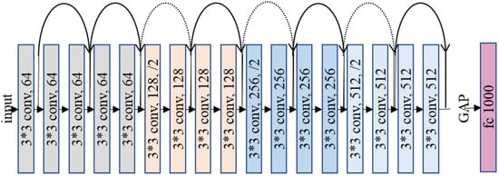 Structure of the ResNet-18. The dotted shortcuts increase dimensions.