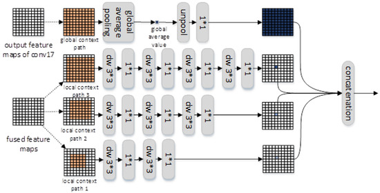 We chose an approach called global average pooling to gather global context. This approach, successfully used to add global context in semantic segmentation tasks [24], is very conveniently deployed and it only consumes a few computations. As shown in Figure 4, the global context path first uses global average pooling to incorporate global context of conv17’s output feature maps to figure out a global average value of the whole feature map. This value is then unpooled (repeated spatially) to the same spatial size of each scale of the fused feature maps, and we get three sets of global feature maps. A 1 × 1 convolutional layer is used to reduce the number of output channels to 128, 64 and 32 respectively. Then each set of the global feature maps is concatenated (channel-wise) with the local context maps separately. Then three sets of feature maps that contain local and global context are produced. Finally, these feature maps are added to the original fused feature maps by element-wise concatenation.