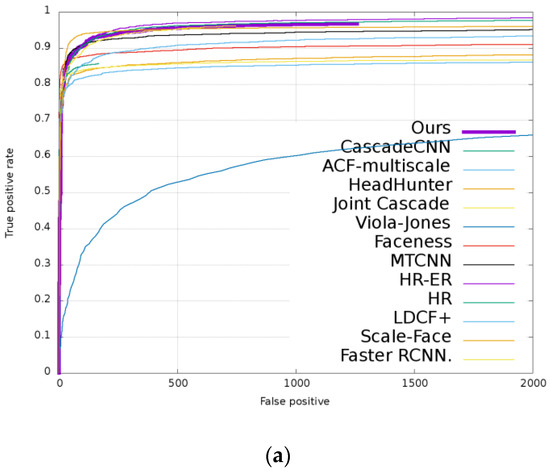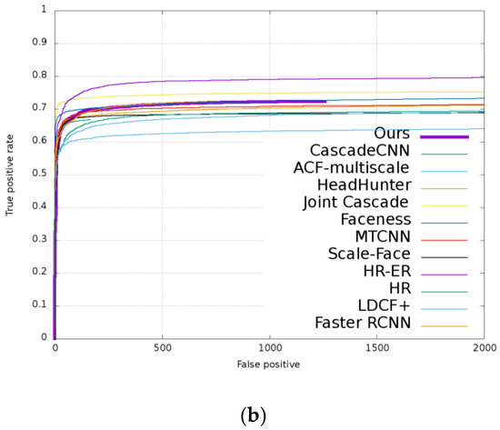 Receiver operating characteristic (ROC) curves on FDDB dataset. (a) Discontinuous ROC curves; (b) Continuous ROC curves.