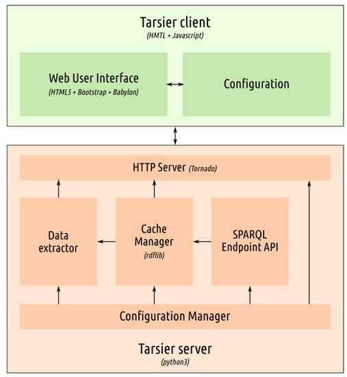 From the implementation point of view, Tarsier server is a Python 3 application that through the framework Tornado (http://www.tornadoweb.org/en/stable/) provides an HTTP interface to receive requests from the clients. The server can be configured through a proper YAML Semantic Application Profile (YSAP) file (a YAML-encoded in the JSAP format: http://wot.arces.unibo.it/TR/jsap.html) containing the port of the server and all the SPARQL queries needed by the Data Extractor. Tarsier server relies on rdflib to maintain a local cache.