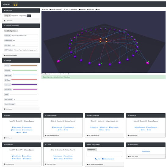 The idea of Tarsier is grounded on the authors’ experience in teaching Semantic Web technologies in the “Interoperability of Embedded Systems” course held at the School of Engineering and Architecture of the University of Bologna. The course is focused on the application of Semantic Web data representation means to context-aware IoT applications. Examples of these applications are presented in [,], respectively, belonging to the areas of Domotics and Electro-mobility with knowledge bases hosting up to one hundred thousand triples. On top of this teaching experience, the authors believe that the learning curve of RDF, RDFS/OWL and SPARQL is often steep, due to the strong linked nature of data. Tarsier should support students learning to deal with RDF knowledge bases by providing an interactive exploration tool for small- or medium-sized knowledge bases (up to a few thousand triples). Through Tarsier, students can play with classes, instances, relationships using filters to toggle their visibility or isolate the interesting entities by moving them on proper semantic planes. The tool would help the students during the so-called “sensemaking” activity that consists in understanding the content and overall structure of an ontology []. Furthermore, we believe that Tarsier can also be helpful for developers to inspect and debug applications based on Semantic Web knowledge bases.