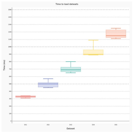 A generic dataset proposed with five different sizes was utilized. Datasets are identified by labels DS#i with . Dataset DS#i contains triples, and the full representation requires drawing spherical meshes and bezier curves (adopted for datatype and object properties). For the purpose of this test, the specific content of the knowledge base does not influence the evaluation.