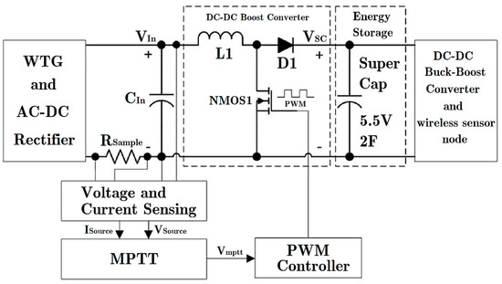 The aim of the MPTT unit is to consistently match the source (WTG) impedance and the load (supercapacitor, DC-DC regulator, and sensor node) impedance. Only this can achieve optimal power conversion efficiency. Therefore, we should design an energy harvesting circuit with a constant input resistance around 400 Ω while transferring energy into the supercapacitor. As for the paper, a Boost converter is chosen to accomplish this purpose. It works in a fixed-frequency discontinuous current mode, as shown in Figure 2. The driving signal of NMOS1 is controlled by the wireless sensor node.