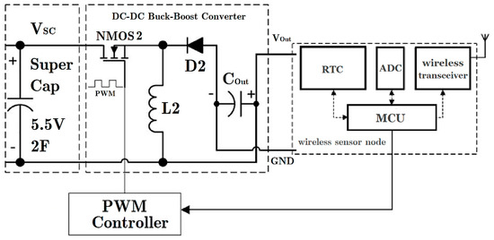 The variation of supercapacitor voltage would change from 0 V to the nominal voltage (usually 5.5 V), so a Buck-Boost converter is essential to regulate the output voltage to (usually 2.4 V for low-power electronics), it also optimizes the power efficiency of wireless sensor node.