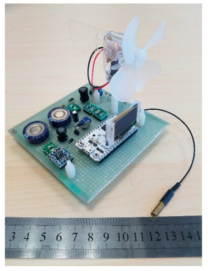 The designed EH-WSN system is connected with a commercially wireless node supplied by Arduino with LoRa, as shown in Figure 4. The WTG tail could adjust the wind-front direction to face the incoming wind at the right angle. As such, the wind incident angle is always perpendicular to the turbine plane. The LoRa node uses the ESP8266 32-bit ultralow-power microcontroller, and it is paired with the SX1278 RF transceiver that is also designed for low-power application. A 2 F & 5.5 V supercapacitor bank of Panasonic is chosen as the energy storage. Since the microcontroller’s strong computation capability, it is very convenient to make use of it to achieve a more accurate and faster MPTT scheme than a dedicated MPPT analog circuit.