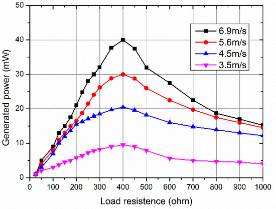 Similar to our previous study [27], a plastic four-bladed horizontal-axis wind turbine is used here, which has a radius of 6 cm and an AC peak voltage of 5.5 V. In addition, it is known: as for a fixed airflow speed, there exists a load value, which could maximize the power generated by the WTG. Therefore, we have tested this WTG under common wind speed and worked out that the load value with maximal output lies between 370 Ω and 420 Ω. Thus, we choose a trade-off value of 400 Ω as (the optimal load resistance maximizing the power generation); i.e., once the external followed-up load matches with , the output power of WTG is always maximized towards any incoming wind speed.