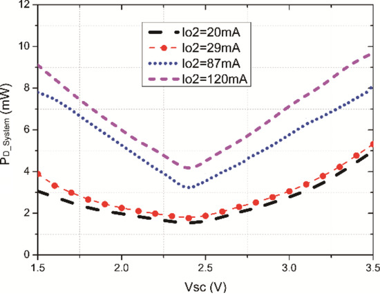 Figure 7 shows the variation of EH-WSN’s overall power loss PD_system with supercapacitor voltage VSC and load current IO2 according to Equation (15). [Note: for the convenience of analysis and comparison, the prediction mechanism in this step is prohibited, the TPC module sets to be a given quantity, and the values of C1, …, C8, are (15, 0.25, 0.004, 0.09, 11, 0.12, 0.004, 0.075)]. As can be seen here, the power dissipation is minimized when VSC changes near VDD = 2.4 V.