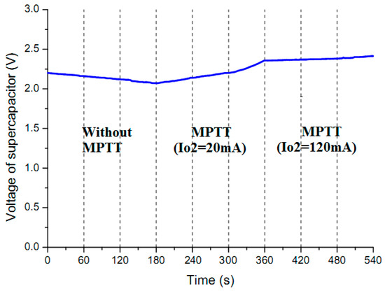 Next, there are three exams to be conducted, which is to differentiate the performance of the MPTT scheme in powering the load. The followed electrical load is at first powered with an EH system but without the MPTT scheme, then with EH system carried on MPTT (IO2 = 20 mA), and finally with EH system running MPTT (IO2 120 mA). The duration for each period is 180 s, and the supercapacitor voltage variation under these conditions is compared in Figure 8.