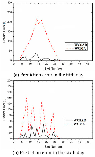 We evaluate the performance of WCSAD by comparing the amount of energy actually harvested during each timeslot against the predicted energy intake. To this end, we implement WCSAD into the wind-powered sensor node and execute an outdoor 7 day continuous running. The invoked duty-cycle is set to be 30 min, parameters υ, τ, ε and ω are 0.6, 0.45, 0.55 and 0.62, respectively, D is considered as 5 regarding the tradeoff between computational accuracy and limited working resources. The predictor error has been compared with WCMA [36] and the selective statistical range is from slot 3 to slot 28, i.e., from 07:30 to 20:00, the result is shown in Figure 9.