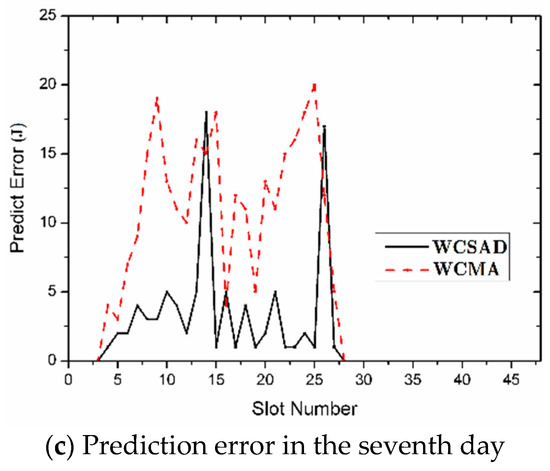 Here in the test the wind speed keeps in hybrid magnitude from day 1 to day 4, however, in the 5th day the air turns to breeze, therefore the harvested energy decreases dramatically, but at last, the 6th day and 7th day just take on a strong breeze. As a result of the severe change between the 5th day and its previous days, WCMA cannot adapt to this variation and leads to a major error in Figure 9a, while WCSAD considers the past data of the harvested energy for reference ingeniously and keeps the error under 15%. In Figure 9b, WCMA slightly eases the impact of weather variation but still cannot offer a predictive value with high confidence, however, WCSAD maintains the accuracy as in the previous. In Figure 9c, the wind category keeps near the same with the day before, thus WCMA and WCSAD both gain a relatively low error rate, whereas WCSAD performs even better with the highest error of only 5%.