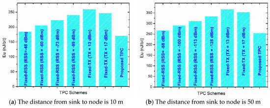 Figure 10 demonstrates the average transmission energy of 10,080 packets (one packet per minute during 7 days). We can see that the proposed method achieves the lowest energy consumption compared with the other TPC strategies no matter the distance. Compared with the fixed-TX scheme, our proposed module achieves energy reduction around 30%. Compared with the fixed-RSS scheme, our proposed module lowers the transmission energy consumption around 15%. The wireless path loss and the background noise are always time varying, a fixed RSSI value or transmission power definitely cannot guarantee the optimal transmission energy efficiency. The proposed TPC module is effective in dynamically selecting the optimal transmission power along with the lowest energy cost Eu.