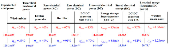The Line diagram in Figure 11 is to illustrate the input and output power available for each subsystem so that the power-conversion efficiency can be resolved. Every value is measured and calculated at the input and output of every subsystem. The data in blue color represents the value of the reference system [24], while the data in red is ours. The test starts from the input with a wind speed of 4.5 m/s where 128.2 mW of raw wind power is supplied to the wind turbine with an efficiency of 39% and 50 mW of mechanical power is available for harvesting. Due to the standard diode-based full-bridge rectifier, 65% of the raw electrical power (ac) is generated at the output of the wind turbine generator. Thus, approximately 20 mW is converted into raw electrical power (dc) of 13 mW. Then after the supercapacitor-charging period (85 min), the energy stored in our system is 19.88 J. In contrast, the reference system has a higher rectifier conversion efficiency because of its smart adaptive strategy. Whereas it adopts a traditional MPTT scheme and gains a lower bit output. However, our system gains significant enhancement in the next stages with a best-matching TPC based converter, where the wireless sensor node has survived for 1.5 h other than the referenced 1.2 h under the working cycle mentioned in a prior achievement [37]. Moreover, certainly in this “ENO” process, the prediction module takes effect as a foundation stone while consuming a neglectable amount of energy.