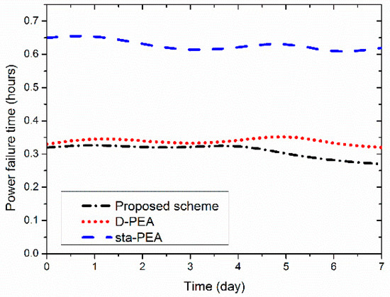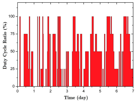 The predictive power management algorithm has a risk of over-assigning energy that possibly leads to power shortage. Therefore, we need to further investigate the power failure time tf. In this section, we compare the proposed system with D-PEA and sta-PEA in reference [38], the test scenario is just the same as step B, and the duty cycle ratio DC’s dynamic variation is shown in Figure 12 primarily (for a direct perception, we classify the ratio into 5 sorts: 0%, 25%, 50%, 75%, and 100%):