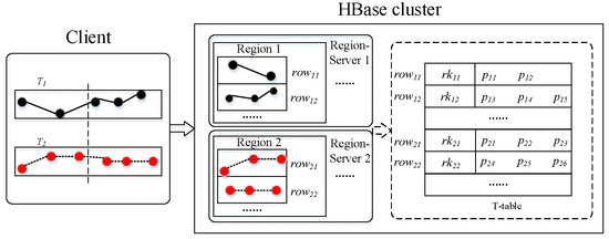 Figure 2 displays the storage process of trajectory data in T-table, where trajectories T1 and T2 are preprocessed as trajectory segments, and then inserted into rows with rowkeys rk11, rk12, rk21, rk22, respectively. Based on the dictionary order of HBase, the trajectory points of T1 or T2 are stored in chronological order. Therefore, if the query rowkeys are orderly, there is no need to sort the query results. In addition, the data of T1 or T2 always locate in the same Region, so when reconstructing the trajectory points into a trajectory, there is no need to request data from other Regions, thus avoiding data transmission and ensuring query efficiency. In order to avoid ambiguity, in the following we use tRegion to refer to the Region of T-table.
