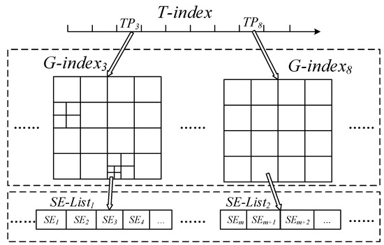 - T-index: For constructing T-index, we divide the time dimension into multiple Time Periods (TPs) in accordance with time series, where each TP element corresponds to a G-index to index all trajectory segments over it. Each TP element is obtained by combining several consecutive TI elements to avoid a single trajectory segment being indexed by multiple T-indexes.